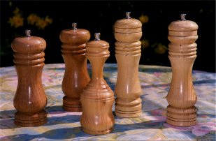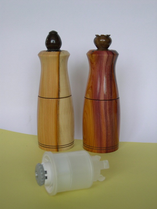 Pepper & Salt mills in Jarrah on Mallee burr base, mustard pot of Jarrah, lined with Boxwood with Ebony finial. Fitted with Cole & Mason fittings. not available |